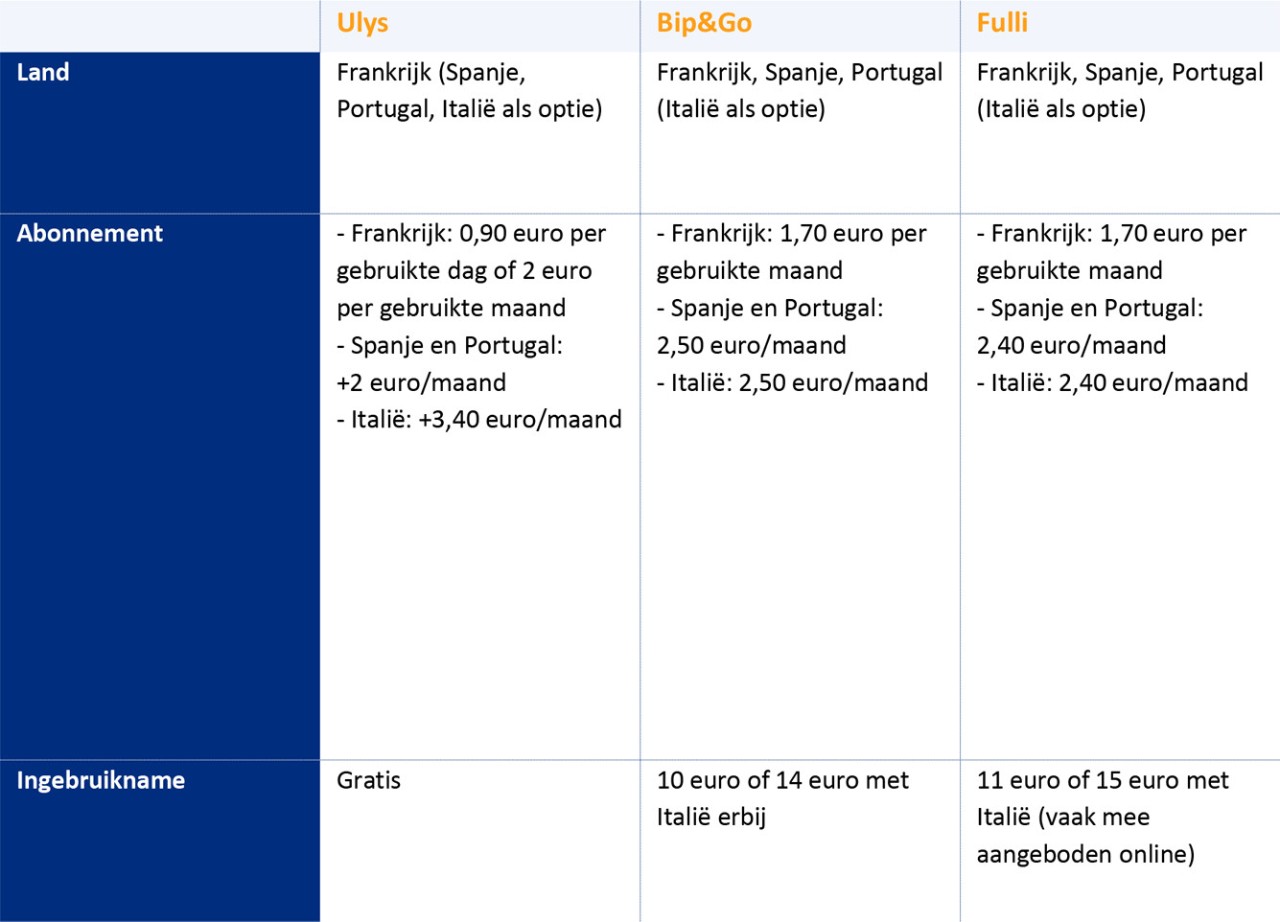Er bestaan verschillende merken van tolbadges. We geven je enkele voorbeelden die je een idee geven van de prijs voor sporadisch gebruik. Je betaalt enkel voor het abonnement op de dagen of maanden dat je de tolbadge gebruikt. Je kan de badge ook gebruiken om te betalen in sommige parkings. Bovendien kan je met een app je verbruik opvolgen.